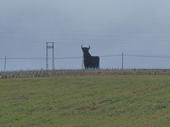 Kaum dass ich ausserhalb von Fuente de Cantos war sah ich einen wilden Stier. Oder halt! Nochmals ganz genau hinsehen. Ah nein, UNGEFÄHRLICH! Der Sier ist fest gemacht! El Tore de Osborne!