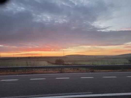Heute bin ich bereits um 07:10 Uhr gestartet in Calzedilla de los Barros. Ich war aber zu faul wieder das ganze Dorf hinauf zu laufen, nur um auf dem Camino zugehen. Also lief ich erst mal ca. 3 km der Bundesstrasse N 630 entlang. Das darf man und kann man auch ohne in Gefahr zu geraten auf diesem Abschnitt. Dann traf der Camino sowieso wieder neben die Bundesstrasse. Was zuvor auf dem Teer sehr Mühelos war, ging jetzt plötzlich nach dem Regen sehr mühsam! Die Erde blieb in Stollen (zwar weniger extrem als am ersten Tag) an den Schuhen kleben. Nach einer Pause stellte ich dann auch fest, wieso der Carrix so sehr schwer war. Die Erde sammelte sich zwischen den beiden Rädern!